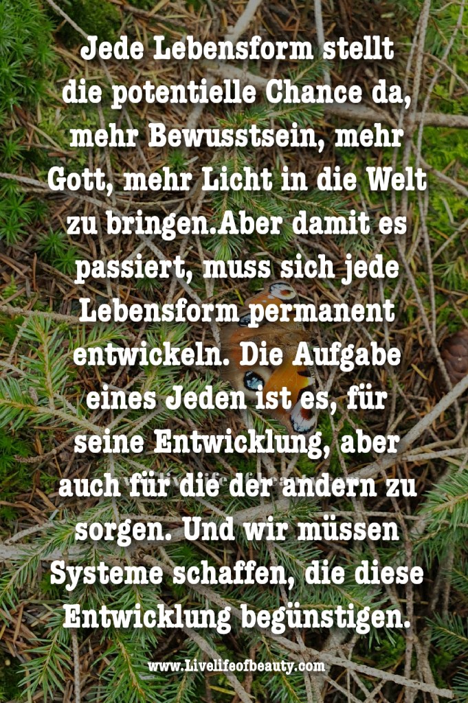 Jede Lebensform stellt die potentielle Chance, mehr Bewusstsein, mehr Gott, mehr Licht und Leben in die Welt zu bringen. Aber damit es passiert, muss sich jede Lebensform permanent entwickeln. Die Aufgabe eines jeden ist es, für seine eigene Entwicklung, aber auch für die der anderen zu sorgen. Und wir müssen Systeme erschaffen, die diese Entwicklung begünstigen. Denn das Allerwichtigste ist das Entfalten des Bewusstseins, das Manifestieren des Bewusstseins, die Expansion des Bewusstseins.